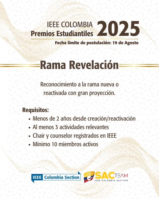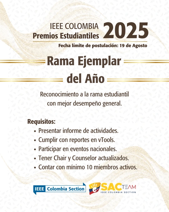 El reconocimiento a la Rama Estudiantil Ejemplar del Año busca destacar aquellas ramas que han demostrado una gestión destacada, tanto interna como externamente, y una participación activa en la comunidad IEEE. Se valorará el cumplimiento de los reportes institucionales, la organización de actividades significativas y la participación en eventos nacionales. Además, es clave contar con liderazgo actualizado y una membresía sólida, lo cual refleja el compromiso y sostenibilidad del grupo.