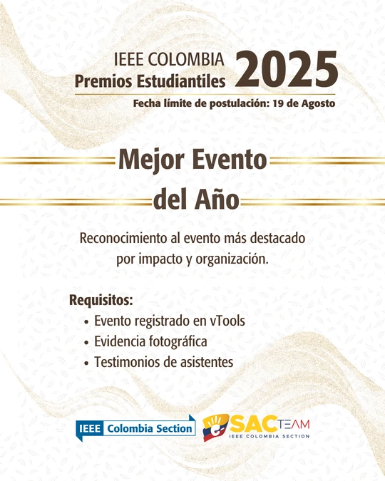 El Mejor Evento del Año premiará aquella actividad que, por su impacto, organización y alcance, haya generado un alto valor para la comunidad IEEE. Se valorará especialmente la creatividad, la calidad logística y el aporte académico o social del evento, así como la forma en que se documentó su ejecución y resultados.